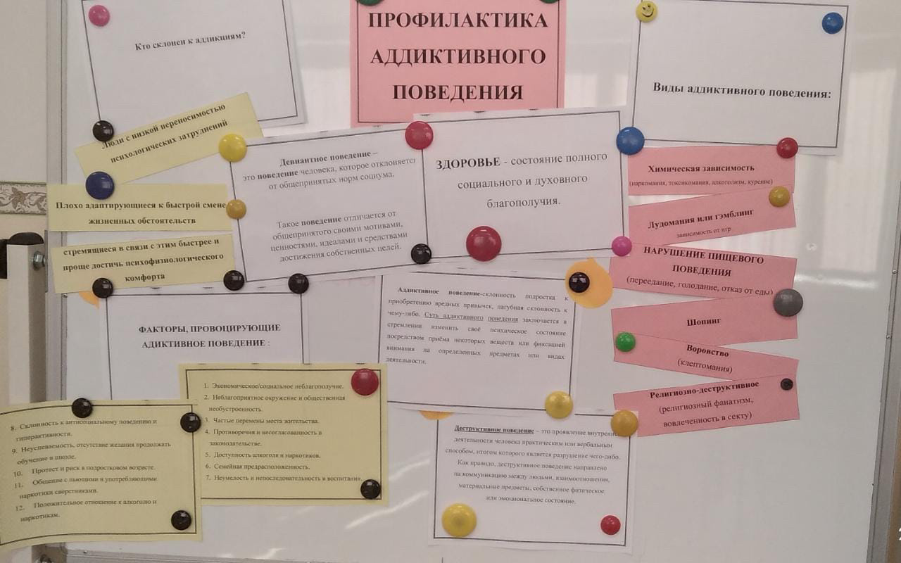Согласно плану-графику проведения профилактических мероприятий по результатам СПТ педагогом-психологом, Брем Натальей Геннадьевной был проведен семинар для педагогов по вопросам профилактики аддиктивного поведения, формирования здорового и безопасного образа жизни среди обучающихся. Главной задачей являлось информирование участников семинара об актуальности проблемы аддиктивного поведения и формированию понятия об аддиктивном поведении, его видах, причинах, формах профилактики.