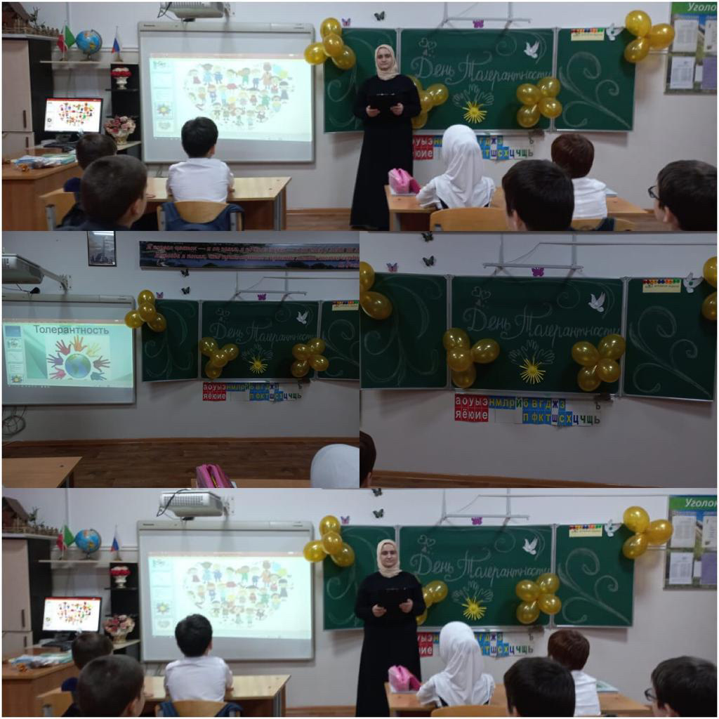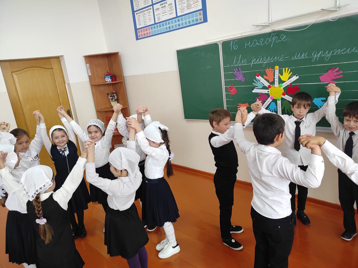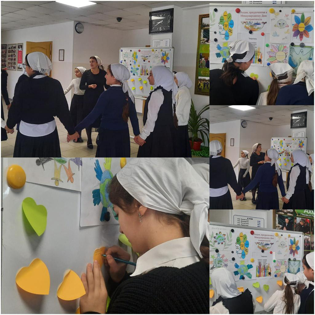 В рамках празднования Дня толерантности в школе были проведены ряд мероприятий, которые совместно разработали психолог, актив школы и заместитель директора по ВР. С целью , которых было знакомство учащихся с понятием толерантности и формирование толерантного отношения и поведения у детей к окружающим людям. Проведены классные часы, беседы " Толерантность в Исламе", книжная выставка " Книги о добре", акция " Возьмёмся за руки, друзья!"