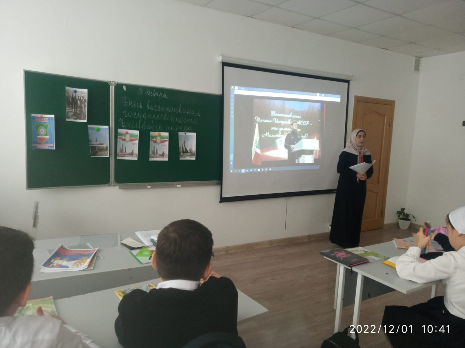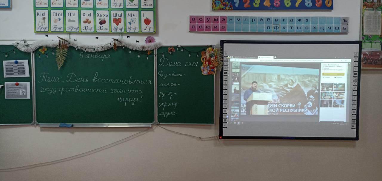 9 января Чеченская Республика отмечает значимую в своей истории дату- День восстановления ЧИАССР.Глава Чеченской Республики Рамзан Кадыров в 2010 году подписал указ об объявлении 9 января Днём восстановления государственности.В рамках мероприятий , посвящённых этой праздничной дате, были проведены тематические классные часы в 2- 11 классах на следующие темы: " Важные страницы нашей истории ", " Живи и помни ".В процесс также были вовлечены и школьные патриотические отряды " Юные Кадыровцы " познакомили учащихся с историей празднования Дня восстановления ЧИАССР, рассказали о тяжёлой и трудной жизни народа в годы ссылки, провели акцию по раздаче буклетов" 9 января- День восстановления ЧИАССР" учителями и учащимся школы....