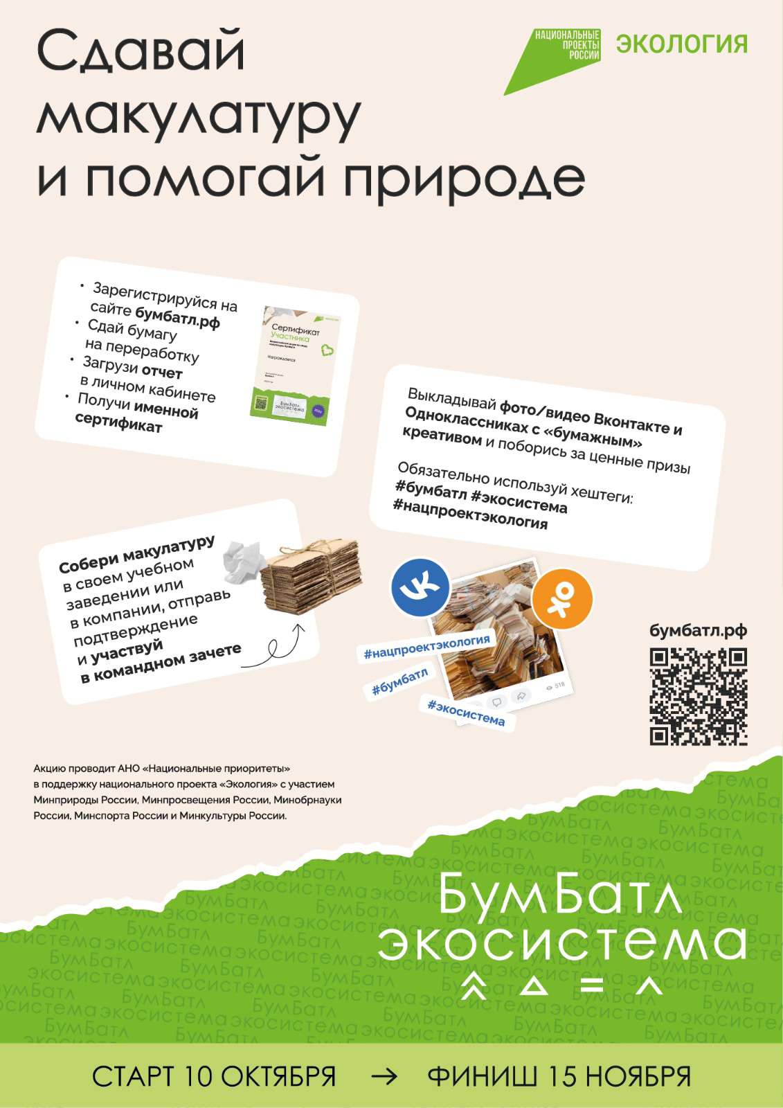 Акция «БумБатл» проходит в поддержку национального проекта «Экология» при участии Минприроды России, Минпросвещения России, Минобрнауки России, Минкультуры России и Минспорта России. Экологический партнер акции – ППК «Российский экологический оператор».