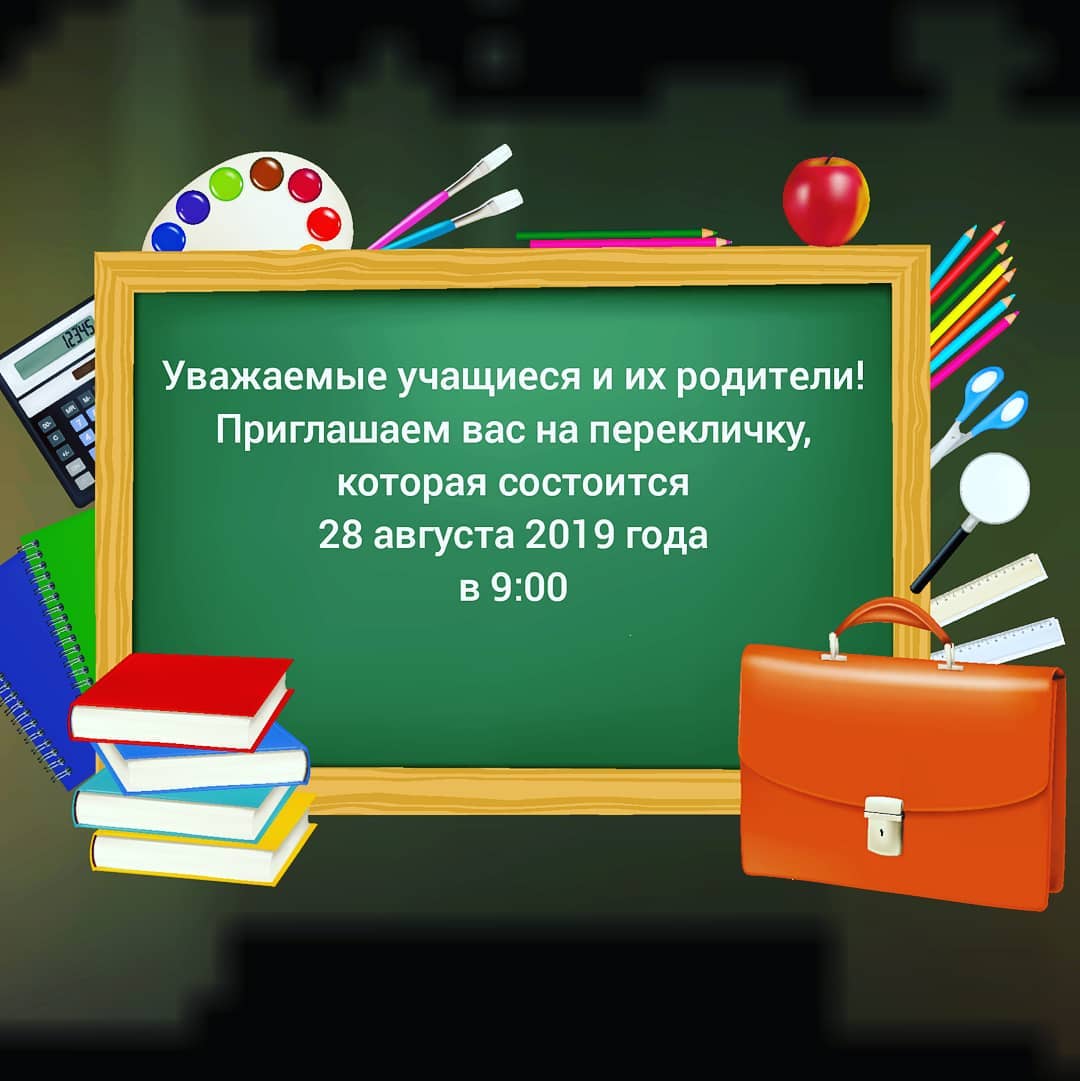 Уважаемые учащиеся и их родители ! Приглашаем вас на перекличку которая состоится 28.08.2019 года в 9:00